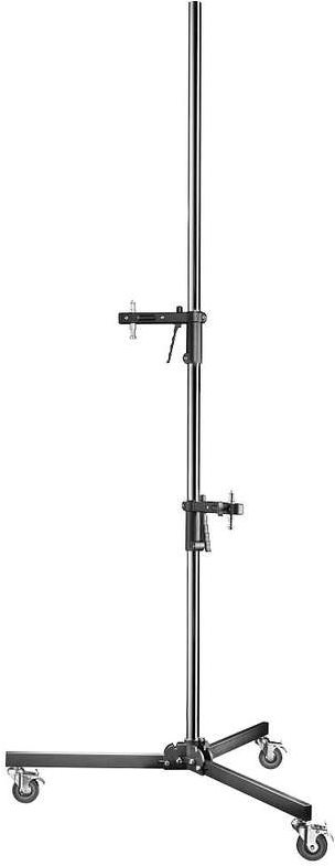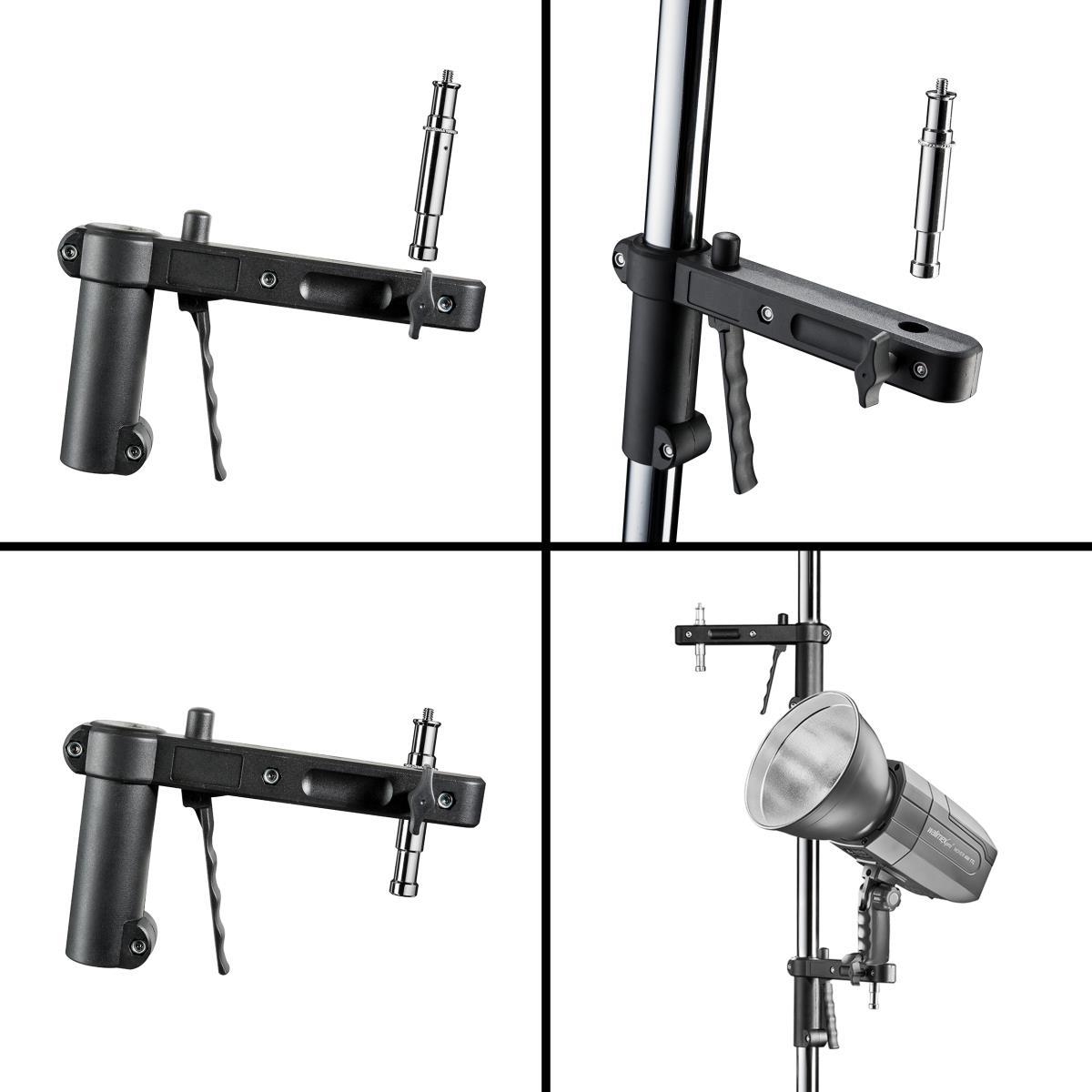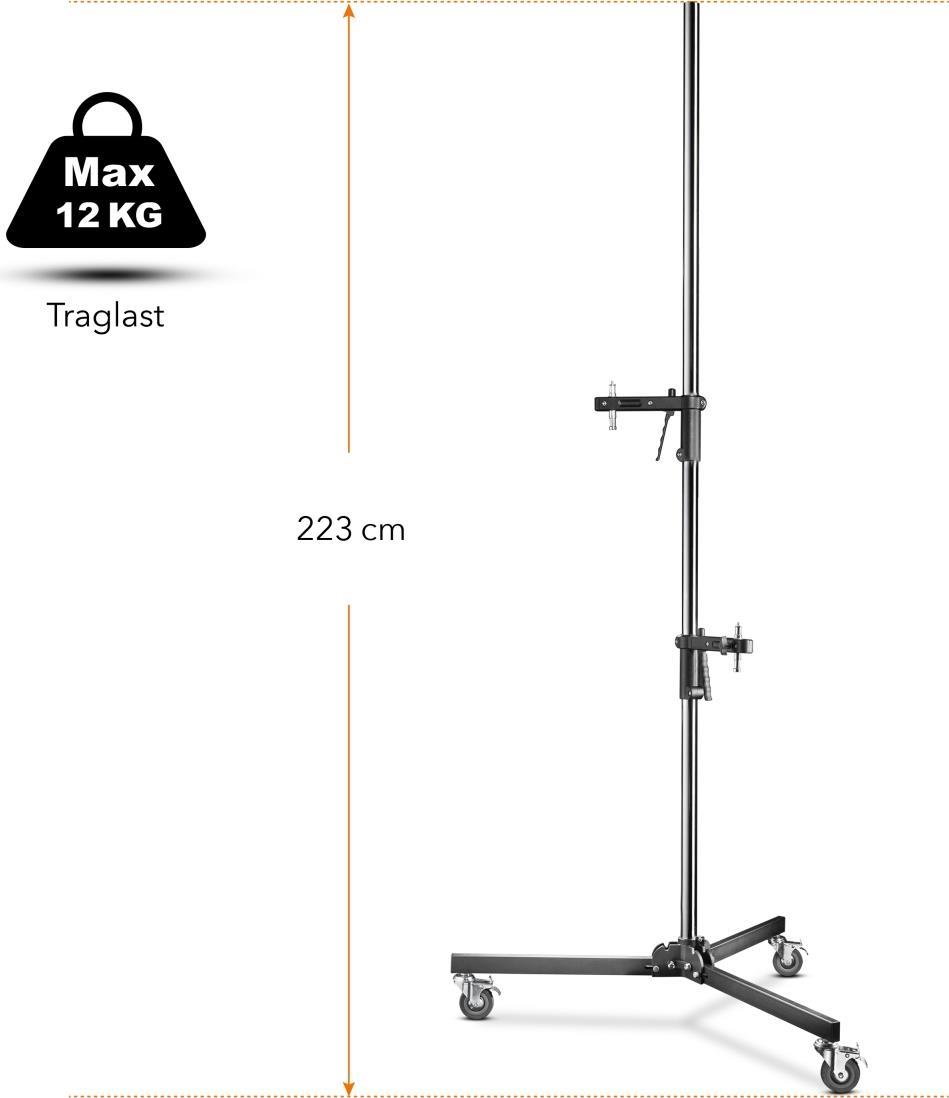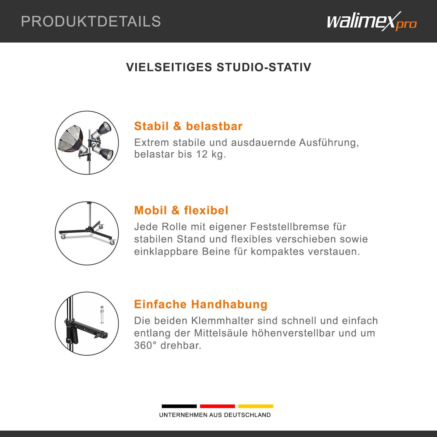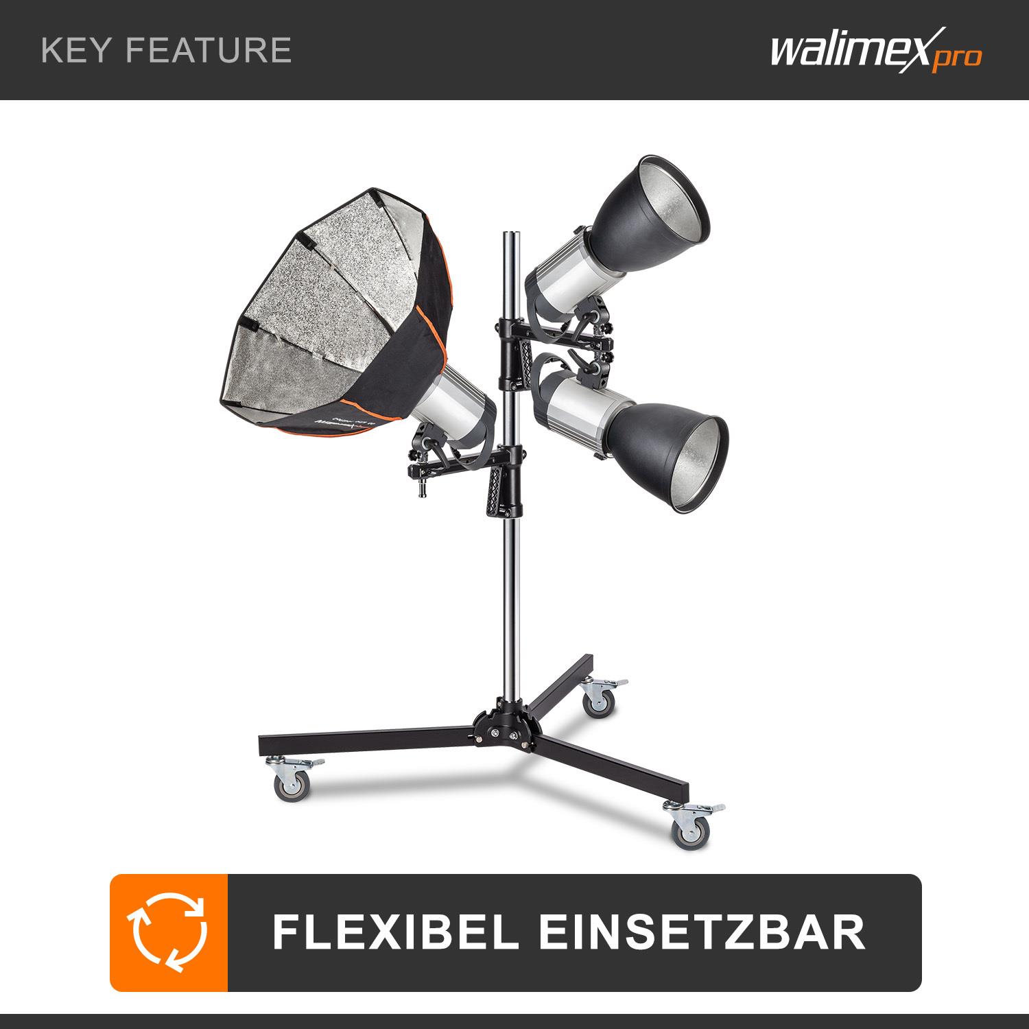 Der Clou an diesem System liegt darin, dass sie viele Anwendungsmöglichkeiten besitzen. So können Sie z.B. sehr schnell aus zwei kleinen Softboxen ein Striplight bauen, in dem Sie diese nur übereinander setzen. Durch stabile und leichtgängige Gummirollen ist das Stativ flexibel handzuhaben und hervorragend für das Studio geeignet. Die Klemmhalter gewährleisten Ihnen eine Belastbarkeit von ca. 12 kg. Sie sind mit einem schnellen Handgriff einfach in der Höhe verstellbar und verfügen je über einen 1/4 Zoll Anschluss. Tipp: Klemmhalter (Art. Nr. 15804) sind auch einzeln erhältlich, damit können sie das System nach individuellen Bedürfnissen erweitern