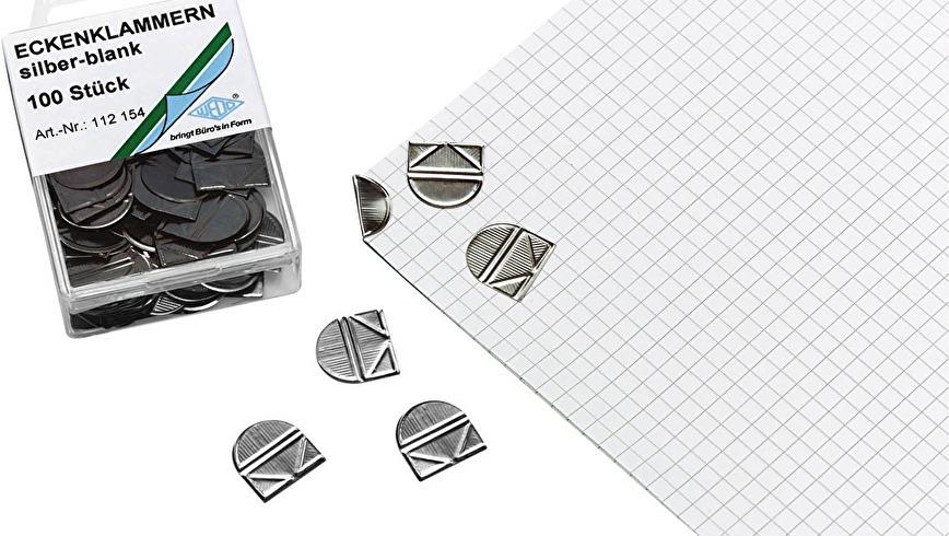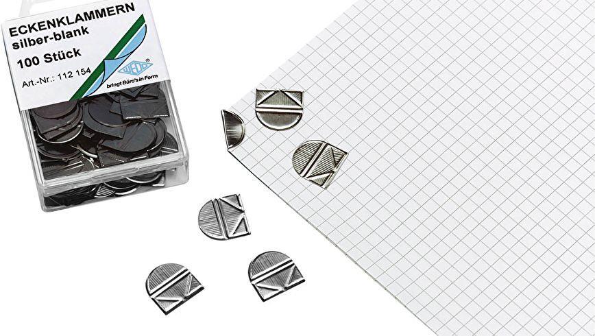 WEDO®-Eckenklammern aus glanzveredeltem Metall. Die etwas andere Art, Dokumente fest aber doch flexibel miteinander zu verbinden. Bis zu 10 Blatt Papier lassen sich problemlos ...
