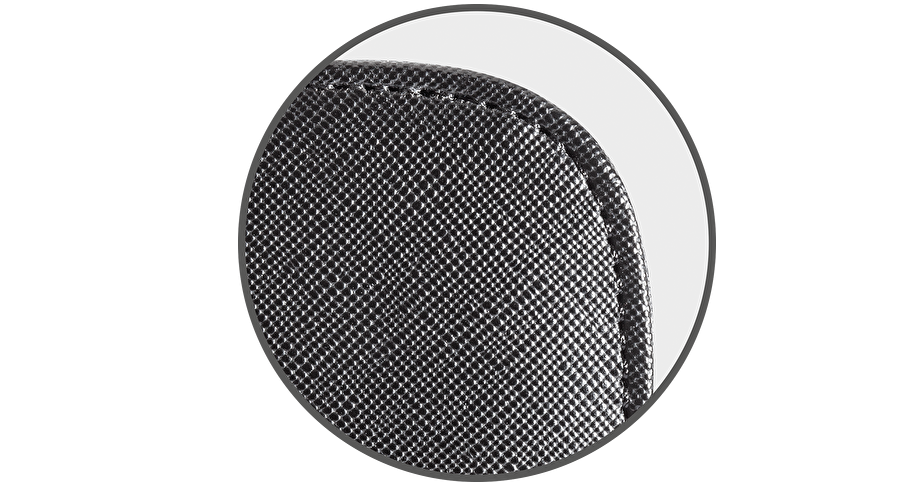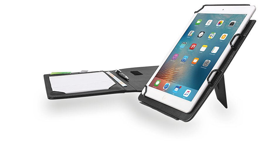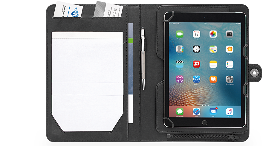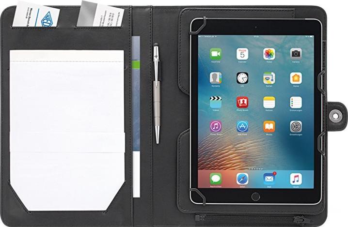 Der Tablethalter mit 2 Aussparungen für Fotolinsen ist mittels Reißverschluss herausnehmbar. Er ist zusätzlich mit einem aufklappbaren Präsentationsständer für Quer- und Hochformat ausgestattet. Zur weiteren Innenausstattung zählen ein A5-Einsteckfach für Unterlagen, 2 Kartenfächer, 1 Stiftschlaufe und 1 A5-Schreibblock.