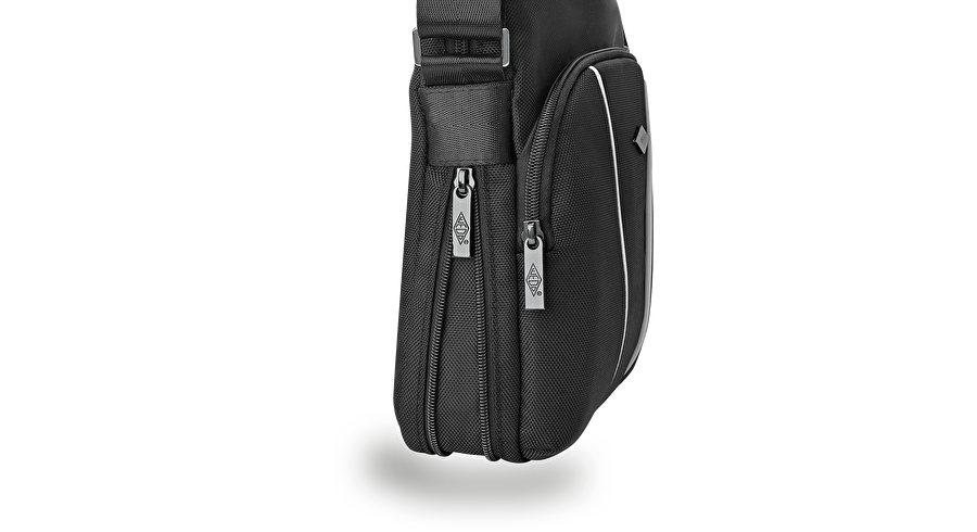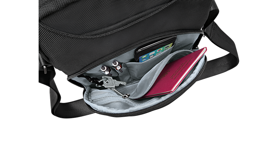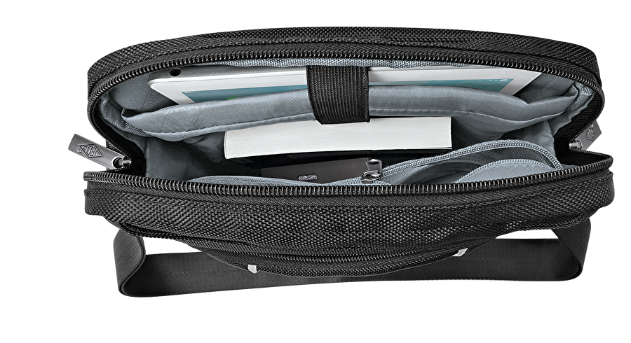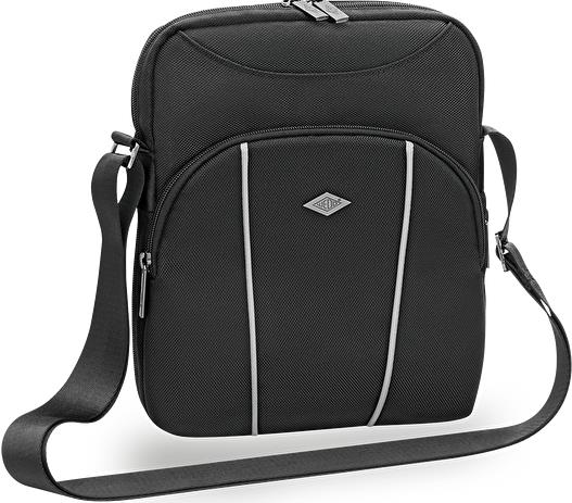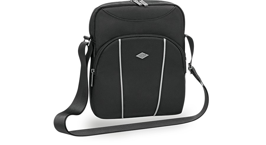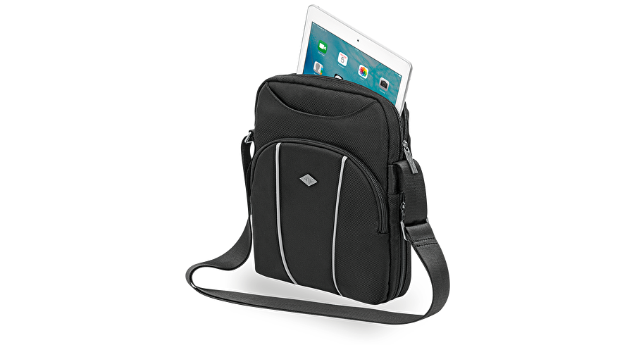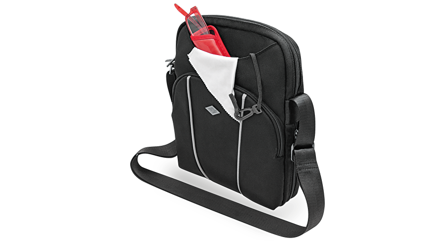 Das Hauptfach ist mit einer mit weichem Fleece gepolsterten Innentasche für Tablets bis 10,5 Zoll sowie einem Reißverschlussfach ausgestattet und bietet zusätzlich Stauraum für Zubehör und A5-Dokumente. Das Volumen kann durch eine Reißverschluss-Dehnfalte erweitert werden. Für schnellen Zugriff sorgt die Organisations-Fronttasche mit Sicherheitsfach, Smartphone-Tasche, zwei Stiftfächern und Schlüsselhalter. In der Deckeltasche ist zusätzlich ein Reinigungstuch für Brille oder Display befestigt. Wertsachen sind im rückseitigen Reißverschlussfach sicher geschützt. Der lange, verstellbare Schultergurt sorgt für hohen Tragekomfort. Die hochwertig verarbeitete Tasche in modernem Design wiegt nur 400 g und ist aus strapazierfähigem Polyester gefertigt. Maße: ca. 25,0 x 7,5 x 29,5 cm. Farbe: schwarz. Lieferung mit bebildertem Anhänger im Polybeutel mit Euroloch.