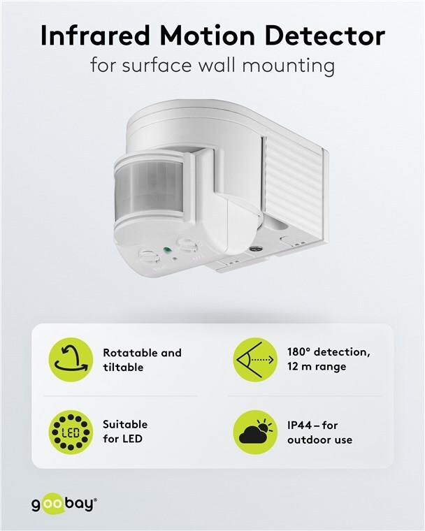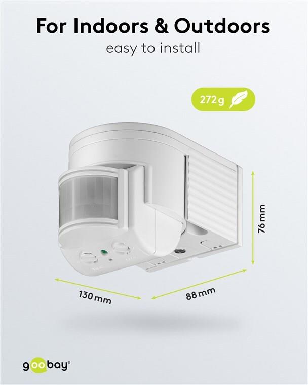 Infrarot Bewegungsmelder zur Wandmontage im Innen-oder Außenbereich mit variabel verstellbarem Sensor. LED geeignet und für andere Leuchtmittel mit geringen Grundlasten.Hauptmerkmale
