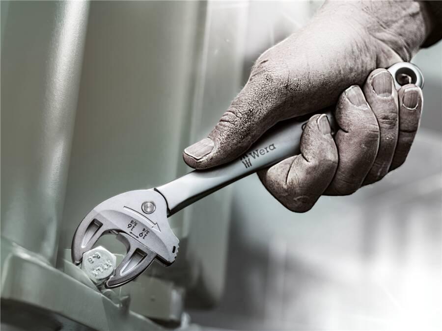 Die Ein-Schenkel-Konstruktion in Verbindung mit der Ratschenfunktion und dem Eckweitenprisma ermöglicht das Arbeiten auch in engen Bauräumen. Der verstellbare Joker 6004 ist das universelle Schraubwerkzeug.