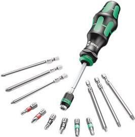 13-teiliger Kraftform Kompakt Satz mit 6x 25 mm langen und 6x 89 mm langen Bits. Die Wera Kompaktwerkzeuge ermöglichen den gleichzeitigen Einsatz der beiden Verschraubungsarten "Hand" oder "Maschine". Das Griff -Wechselklingensystem in kompakter Bauweise mit verschiedenen Klingenspitzen auf kleinstem Raum macht den Anwender mobil und flexibel. Geeignet für Bits mit 1/4"-Außensechskantantrieb nach DIN ISO 1173-C 6,3 und E 6,3 (ISO 1173) und Wera Anschluss-Reihen 1 und 4. Mit Verbindungsteil, Bajonett, Rapidaptor-Technologie. Kraftform-Griff mit Abrollschutz, mehrkomponentig für besonders ergonomisches Verschrauben. Integriertes Magazin zur Aufbewahrung von 25 mm langen Bits. Dieses Set ersetzt einen 12-teiligen Schraubendrehersatz und reduziert die notwendige Ausrüstung auf ein Minimum. Profil und Größe der Bits sind durch den Wera Werkzeugfinder Take it easy mit seiner Farbcodierung und gut sichtbaren Beschriftung leicht erkennbar.
