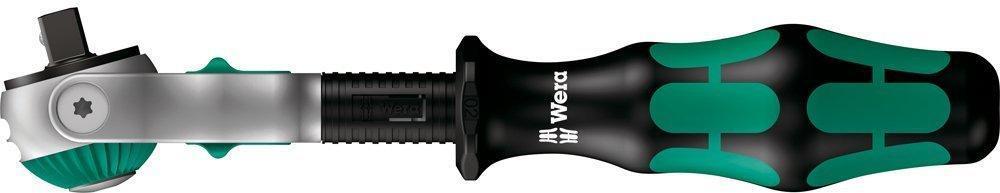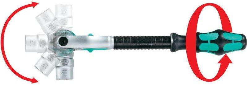 Zyklop-Ratsche mit 1/4" Antrieb. Die Feinverzahnung mit 72 Zähnen ermöglicht einen geringen Rückholwinkel von 5°. Der Knarrenkopf ist frei schwenkbar und kann mit dem beidseitigen Schiebeschalter in jeder Position arretiert werden. Unproblematisches Arbeiten mit viel Handfreiheit auch in sehr engen oder schwer zugänglichen Einbausituationen. Die vordefinierten Positionen 0°, 15° und 90° nach links und rechts garantieren sicheres Arbeiten ohne Abrutschen des Ratschenkopfes. In der 0°-Position kann die Ratsche mit Adapter und Bit wie ein herkömmlicher Schraubendreher verwendet werden. Die Schwungradkonstruktion trägt zur Beschleunigung des Schraubvorgangs bei. Das rotationssymmetrische Design des Kraftform-Griffs und die schnelldrehende Hülse unterstützen das schnelle Drehen. Dank der perfekt an die Hand angepassten Form des Kraftform-Griffs werden Handverletzungen wie Blasen und Schwielen vermieden. Die für den Griff verwendeten harten Materialien garantieren einen schnellen Handwechsel, ohne dass die Gefahr besteht, dass die Haut am Griff "kleben" bleibt. Die weicheren, "rutschfesten" Zonen bieten eine verlustfreie Übertragung hoher Kräfte. Für 1/4"-Vierkant-Steckschlüsseleinsätze sowie 1/4"-Verbinder mit Vierkantantrieb, mit Kugelsicherung.