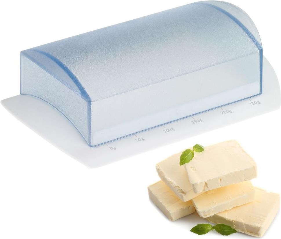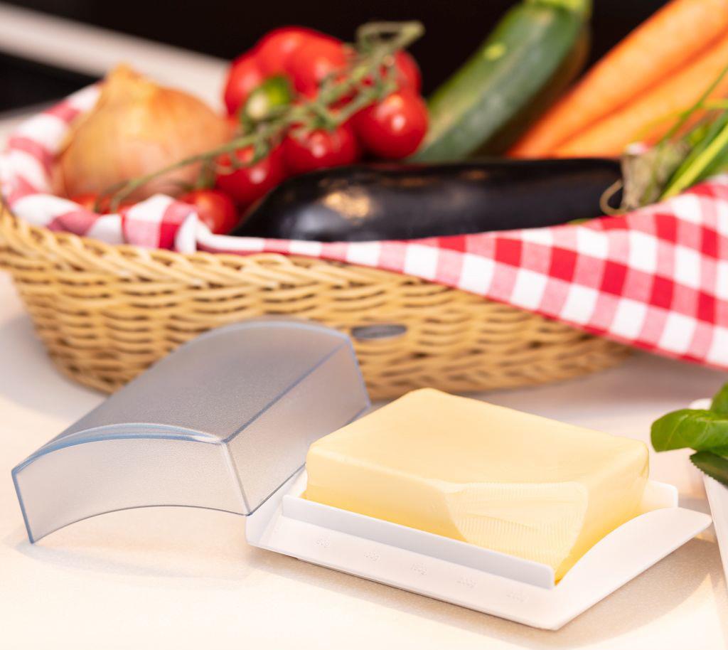 Streichfähiger GenussDie praktische Butterdose aus hochwertigem, robustem Kunststoff ist zum Aufbewahren und Servieren von einem 250 g-Stück Butter genau der richtige Helfer. Dank der praktischen Außenskala am Rand hat ...