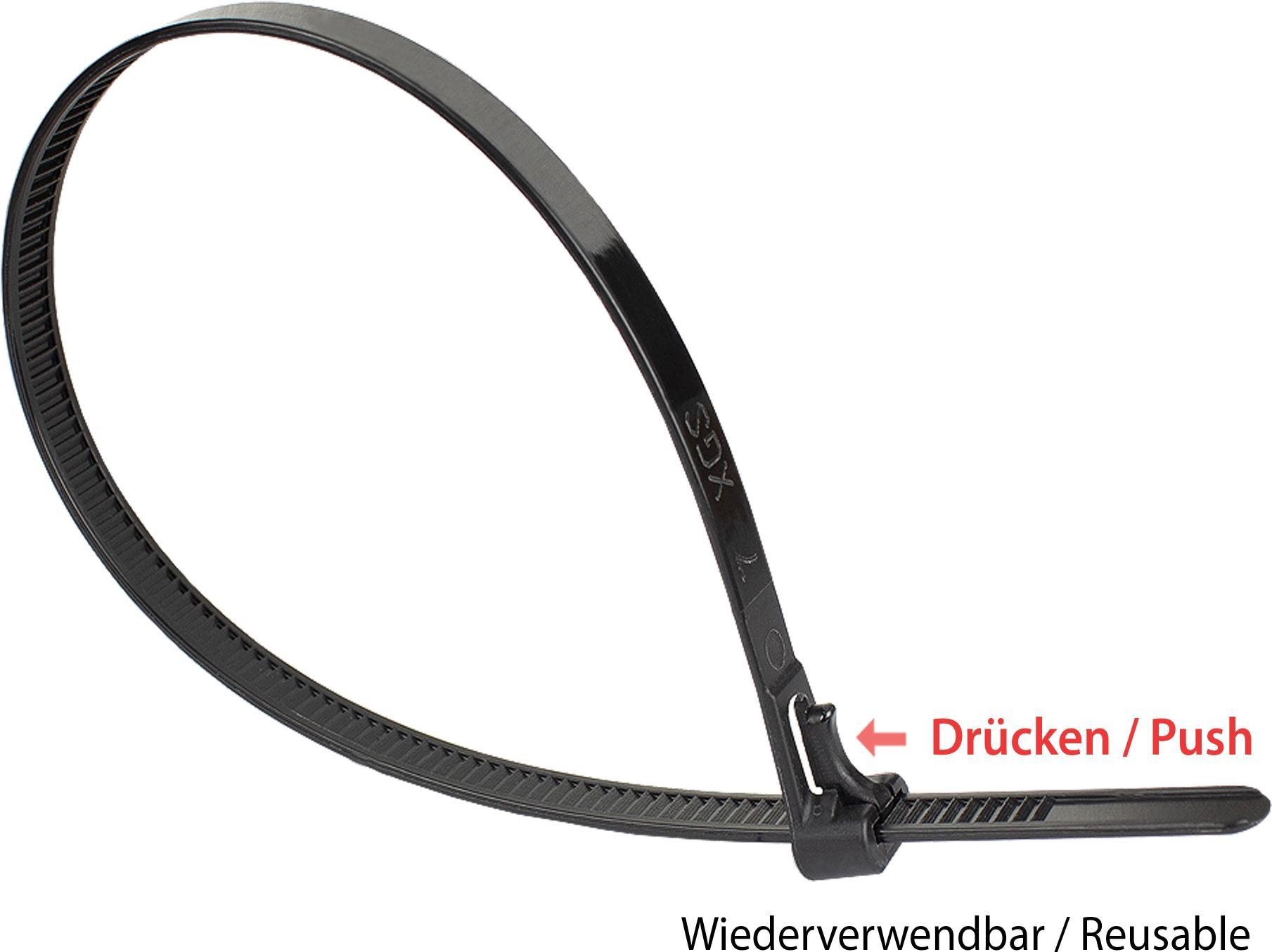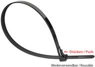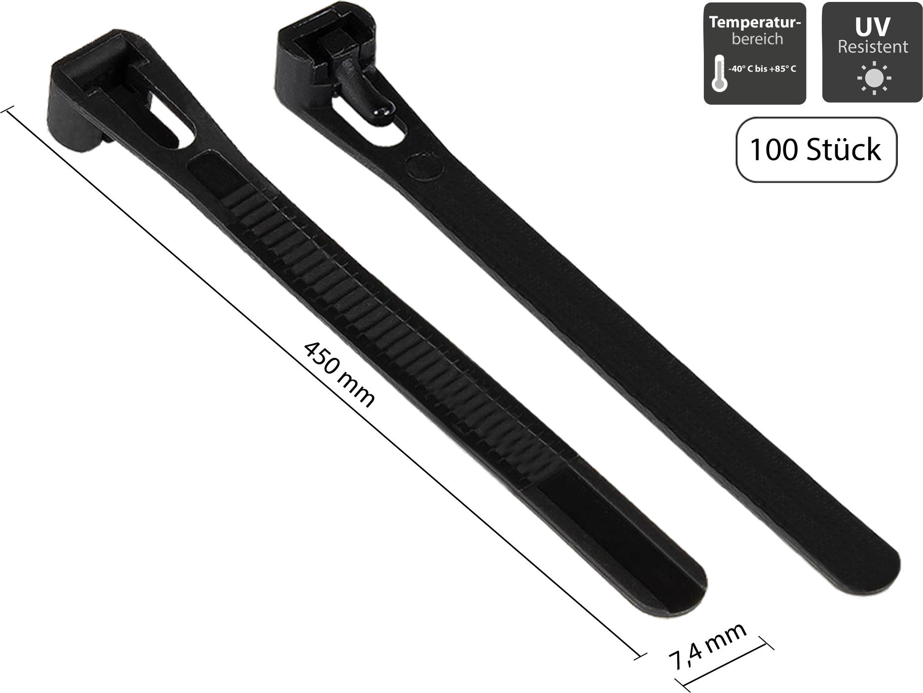 Wiederverwendbarer Kabelbinder 450 mm x 7,4 mm, schwarz, UV-resistent, -40 °C bis +85 °C, 100 Stück (KAB-R45S74)