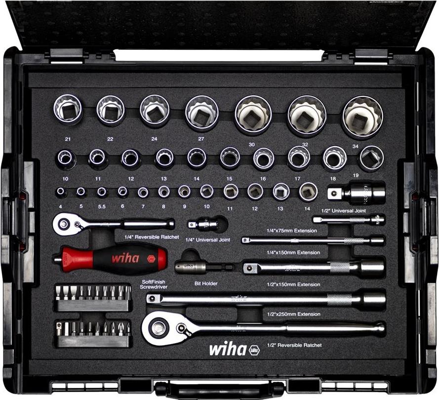 Schraub- und Montagearbeiten erfordern viele verschiedene Profile. Das 60-teilige Steckschlüsseleinsatz-Set von Wiha bietet dem Anwender eine umfangreiche Auswahl der gängigen Steckschlüsseleinsätze. Damit können Anwender jede Befestigung einfach anziehen und lösen. Dank der L Boxx im Wiha-Design sind alle Werkzeuge in einem flexiblen Transport- und Aufbewahrungssystem sicher organisiert. Durch die robuste Bauweise sind sie für alle Anforderungen des professionellen Anwenders geeignet und lassen sich durch den Klick-Mechanismus einfach stapeln und transportieren. Die rutschfeste Oberflächenbeschaffenheit sorgt für einen sicheren Halt, auch bei öligen oder nassen Arbeitsbedingungen.
