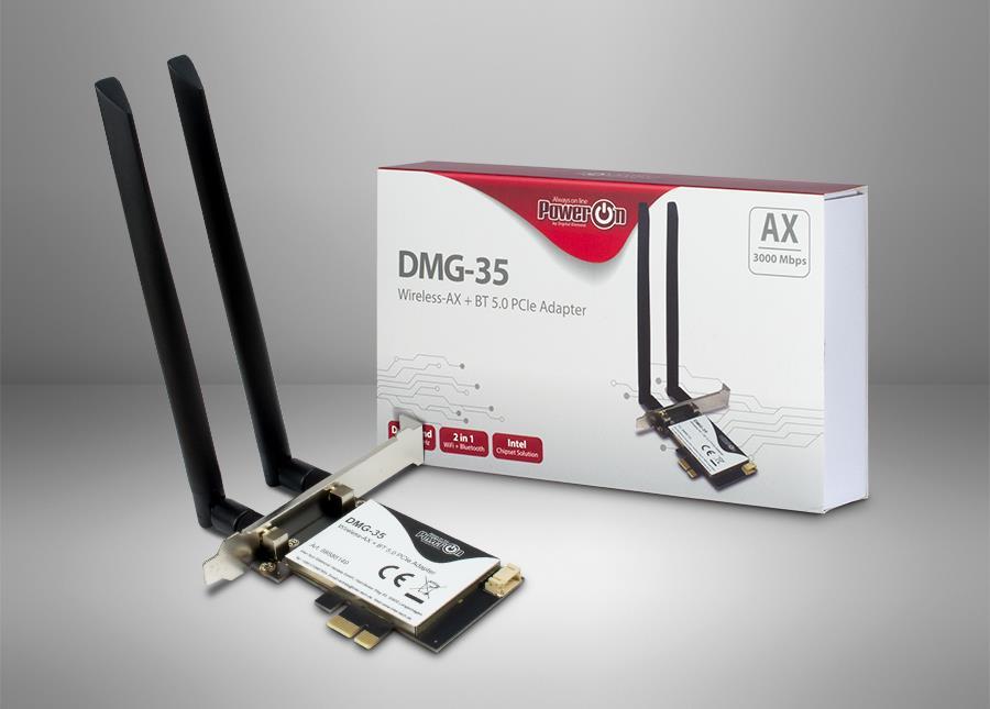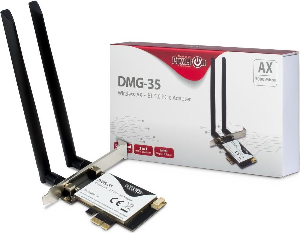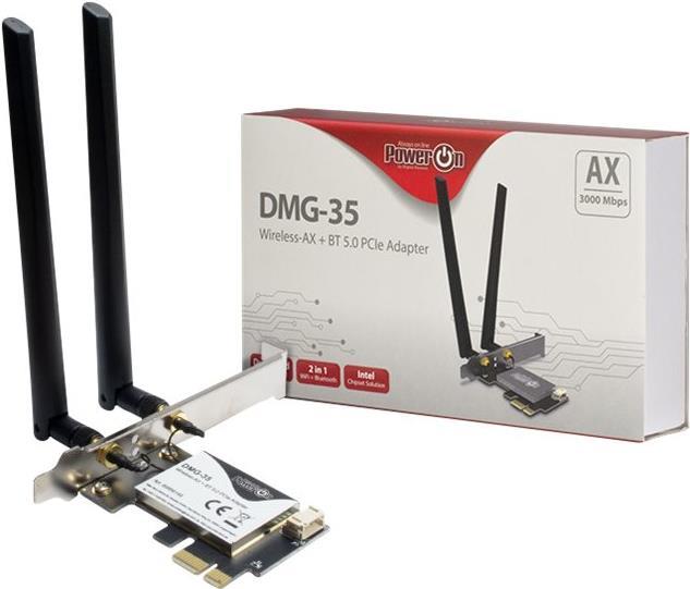 Produkttext[/head]Der DMG-35 ist ein 2in1 WLAN- & Bluetooth 5.0-Adapter. Er ermöglicht Ihnen, Ihren PC mit dem WLAN-Netzwerk zu Hause oder im Büro zu verbinden. Der WLAN (802.11 a/b/g/n/ac/ax) PCIe-Adapter ist mit einem modernen Intel AX200 Chipsatz ausgestattet und bietet mit Geschwindigkeiten von bis zu 3000Mbps im 2,4GHz oder 5GHz Netz die ideale Basis für ein High-Speed Datentransfer.Neben der WLAN-Funktion bietet der DMG-35 auch eine Bluetooth 5.0 Schnittstelle und ermöglicht Ihnen so Ihren Computer mit einem Smartphone, Tablet oder einem anderen Bluetooth Gerät zu verbinden.Da WLAN und Bluetooth Verbindung gleichzeitig möglich sind, können Sie mit Hilfe des DMG-35 z.B. Dateien aus Ihrem WLAN Netzwerk direkt auf Ihrem Bluetooth Lautsprecher oder Kopfhörer abspielen.[head]Hauptmerkmale
