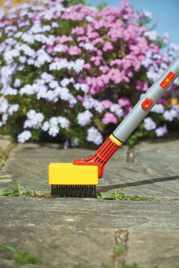 Damit das Gerät auch bis in die kleinste Fuge gelangen und das unerwünschte Grün heraus kratzen kann, laufen die Metallborsten akkurat spitz zu. Die Fugenbürste funktioniert mit den WOLF-Garten multi-star®-Stielen - auch denen die bereits zu Hause benutzt werden