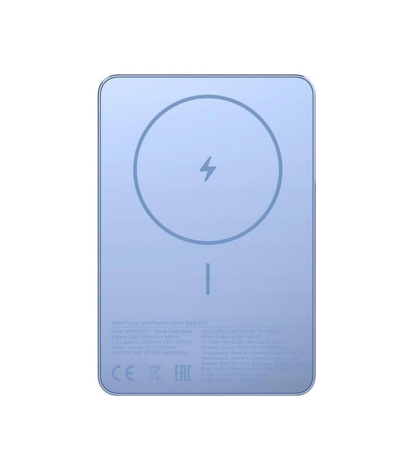 Die Xiaomi Super Slim Magnetic Power Bank 5000 in Blau bietet ultradünnes Design und magnetische Befestigung für nahtloses kabelloses Laden. Ideal für Smartphones wie iPhone, mit 5000 mAh Kapazität und Schnellladefunktion bis 22,5 W. Kompakt und leicht, perfekt für unterwegs – laden Sie Ihr Gerät bequem ohne Kabel.