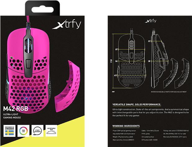 Xtrfy M42. Formfaktor: Beidhändig. Bewegungerfassungs Technologie: Optisch, Geräteschnittstelle: USB Typ-A, Bewegung Auflösung: 16000 DPI, Tastentyp: Gedrückte Tasten, Scroll Typ: Rad, Beschleunigung (Max.): 50 G. Farben der Beleuchtung: Multi. Energiequelle: Kabel. Produktfarbe: Pink (M42-RGB-PINK)