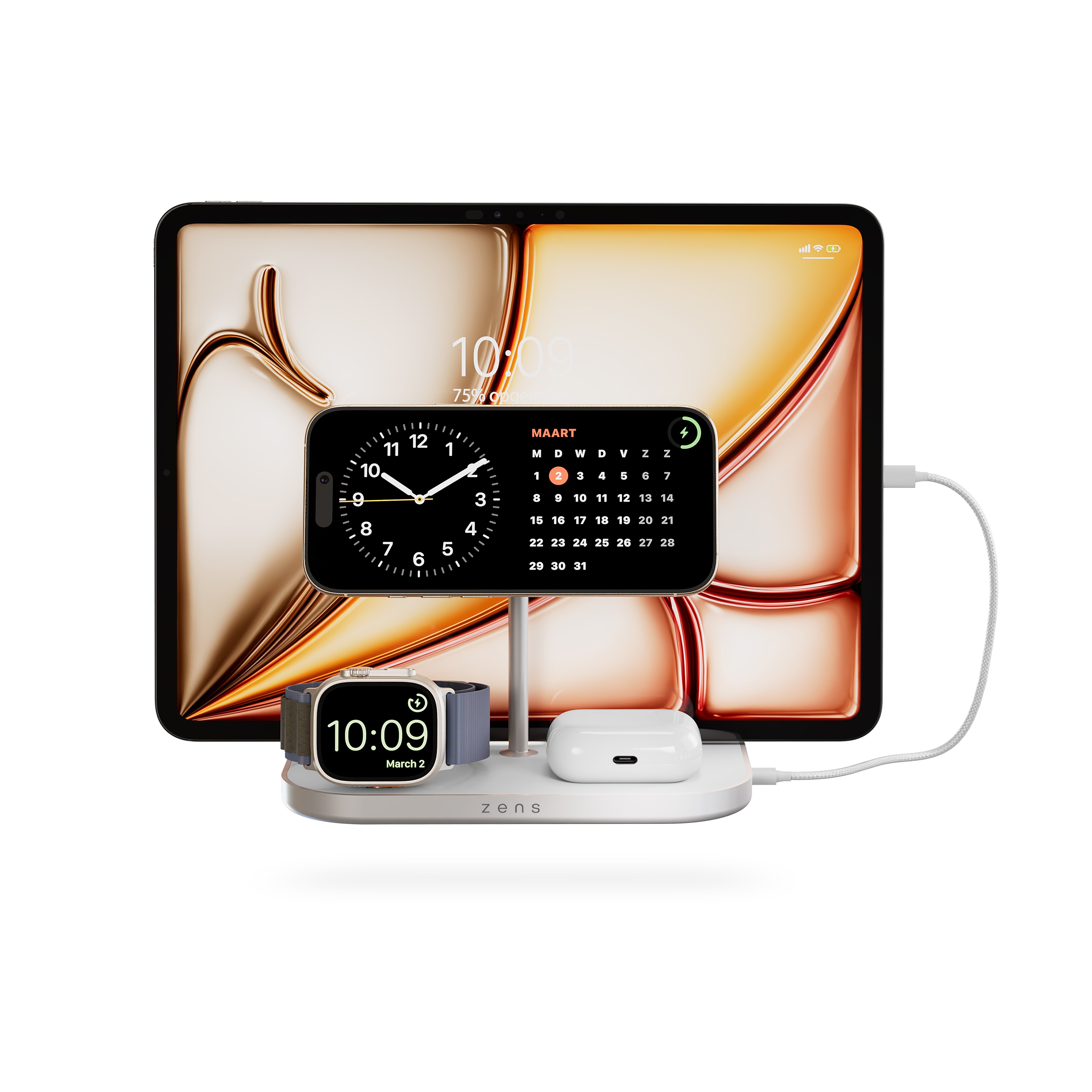 Das ZENS 4-in-1 Magnetic + Watch Wireless Charger ist eine vielseitige Lösung zum gleichzeitigen Laden mehrerer Geräte. Diese kabellose Ladestation eignet sich für Smartphones, Smartwatches und kabellose Ohrhörer und ist damit ein ideales Zubehör für technikaffine Nutzer. Mit ihrer eleganten Aluminiumoberfläche passt sie perfekt zu modernem Design und unterstützt MagSafe-Kompatibilität, wodurch eine mühelose magnetische Verbindung gewährleistet ist.