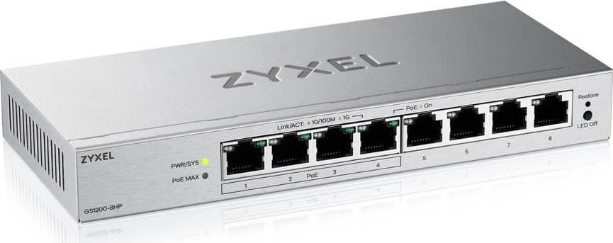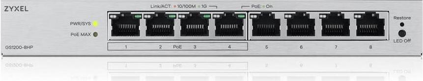 • ZyXEL 8-Port Gigabit PoE+ Web / Smart Managed Switch, 4x PoE+, 68 Watt, (GS1200-8HPV3-EU0101F)
